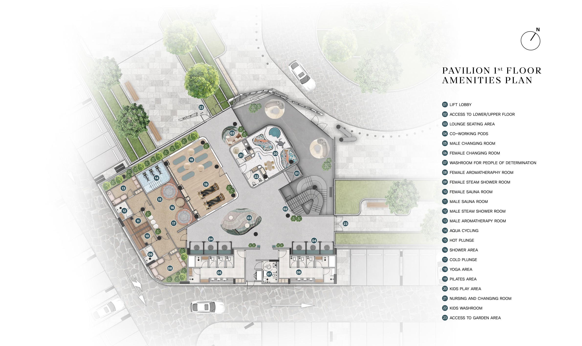 La résidence propose plus de 50+ équipements premium, organisés autour d’un vaste podium paysager et d’un pavillon central unique. Parmi les prestations phares (issues des pages 16–35 de la brochure, livraison fin 2029)